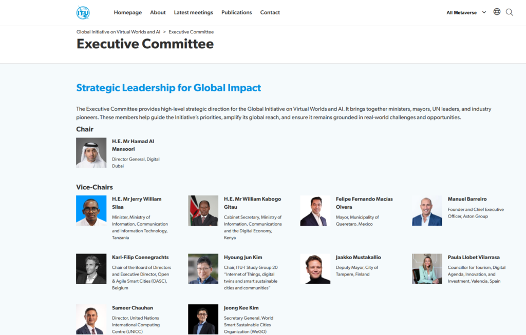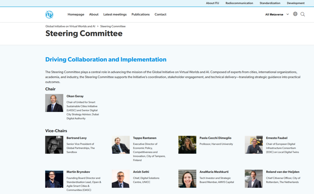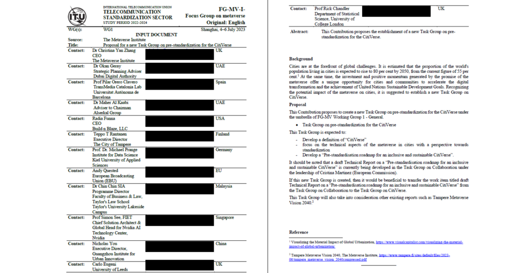 In Feb 2023, The Metaverse Institute submit a proposal to The International Telecommunication Union to set up a new task group for the Pre-standardisation for the Citiverse together with a group of other supporting organisations including Digital Dubai, The City of Tampere, Nvidia etc. This was approved in July 2023. I was appointed co-chairman alongside Cristina Martinez, then Deputy Head of Smart Technologies for communities at European Commission, leading the EU Citiverse initiative.